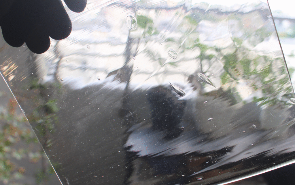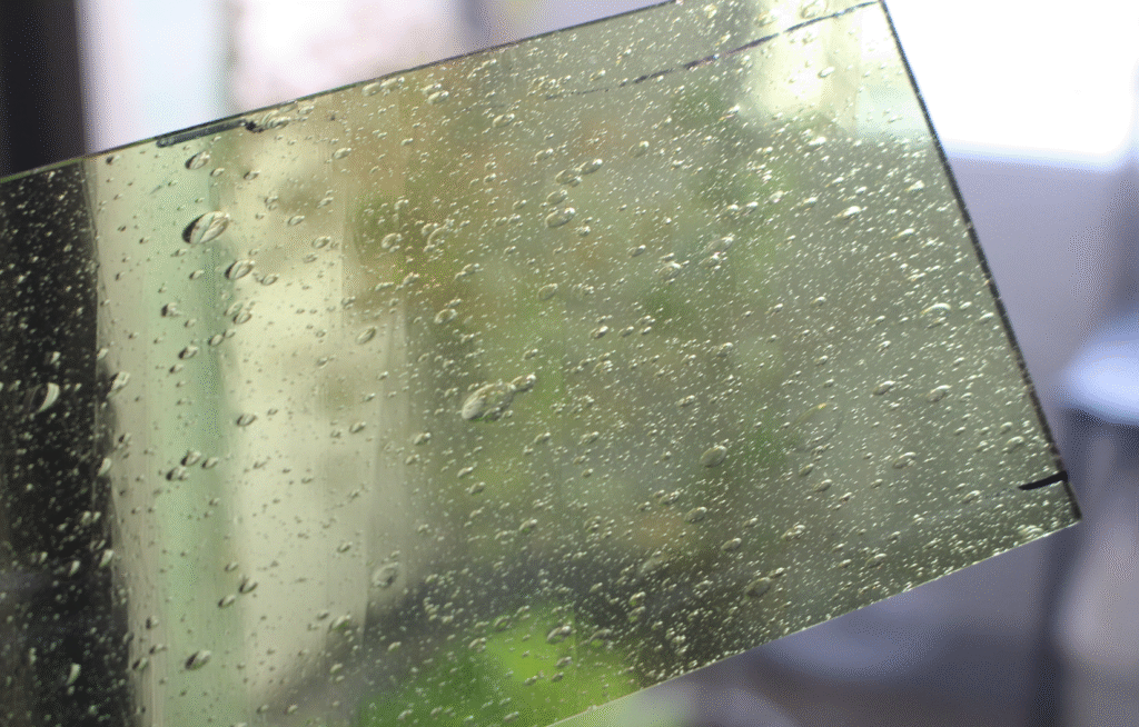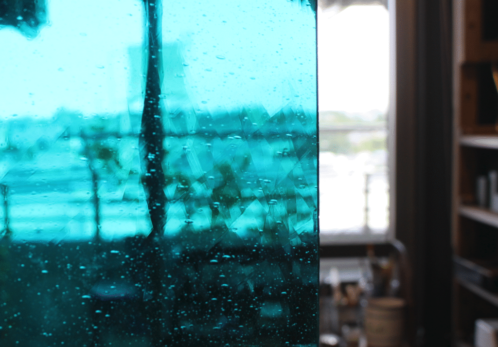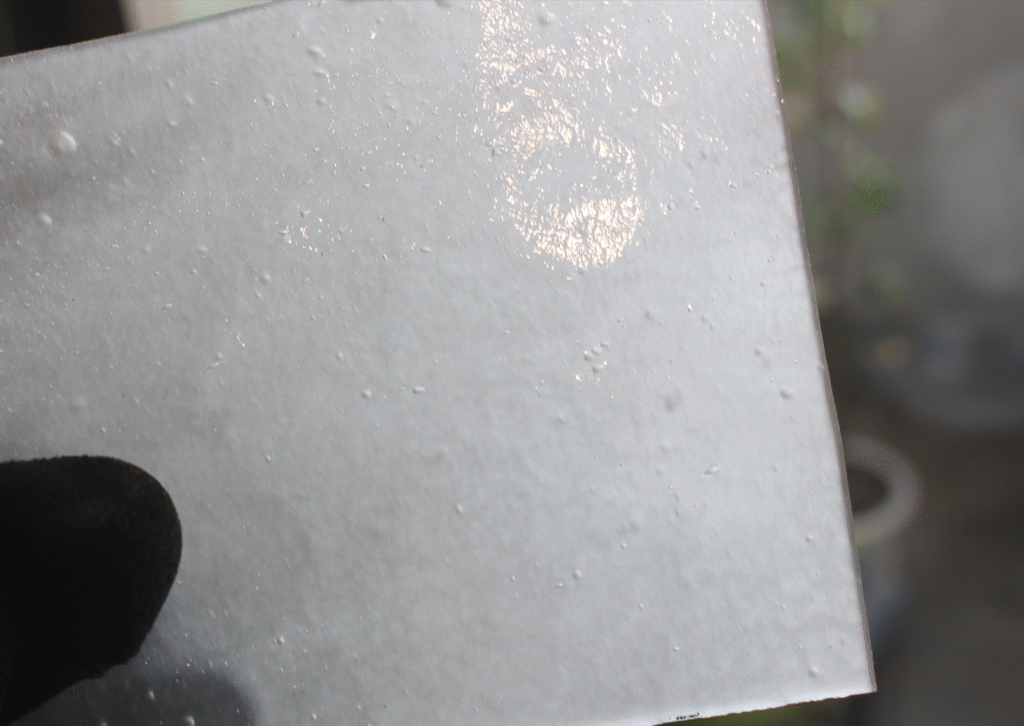 ガラス表面に残された水分と乾燥が繰り返される状況で、ガラスから溶け出す成分と空気中の酸性ガスが化学反応を起こして、ガラス表面が変色・白濁すること。