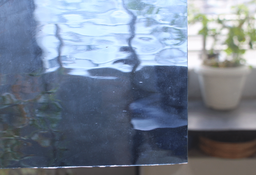機械で作るガラスは鉄板の上で伸ばされたりするのに対し、吹いて作るアンティークガラスはガラス表面がどこにも触れずに制作されるので、ガラス全面が火の熱で磨かれ、艶やかな質感を生み出します。