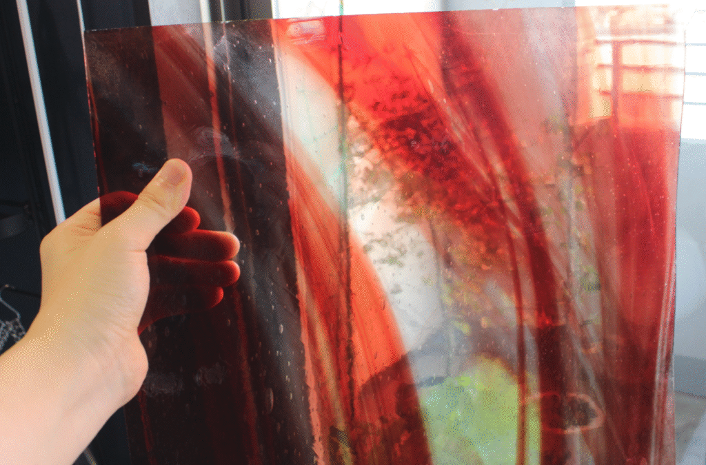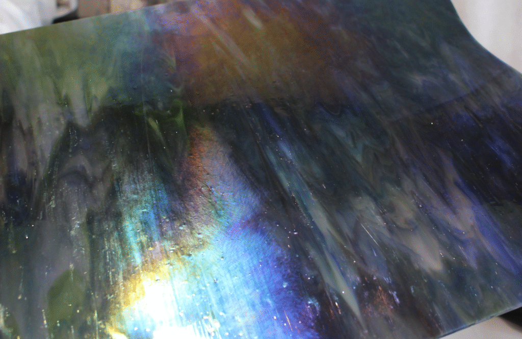 また下の画像のように1枚のピースで2色の表現をしたい場合は、アンティークガラスのなかでも「被せガラス」と呼ばれる特殊なガラスを使う必要があります。マシンメイドの被せガラスはありません。