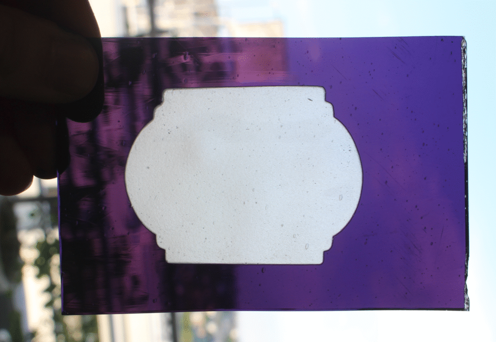マスキングをし、露出したガラス表面の一部を削ることで、1枚のガラスで2色以上の表現ができる。